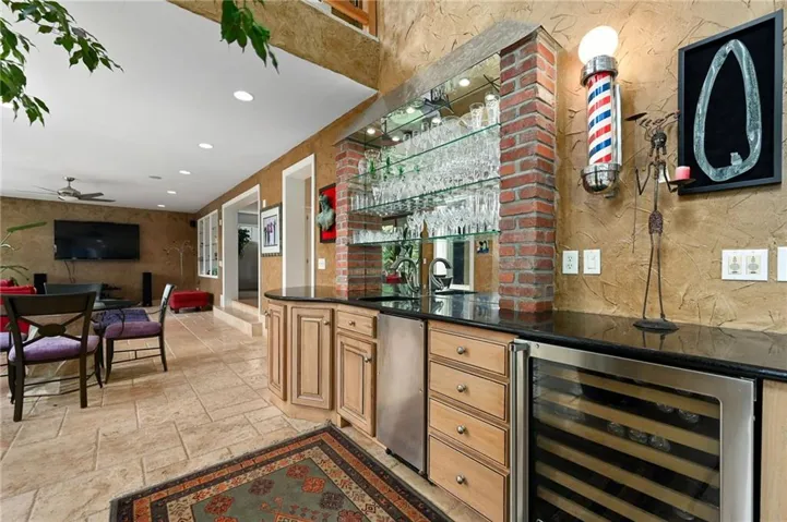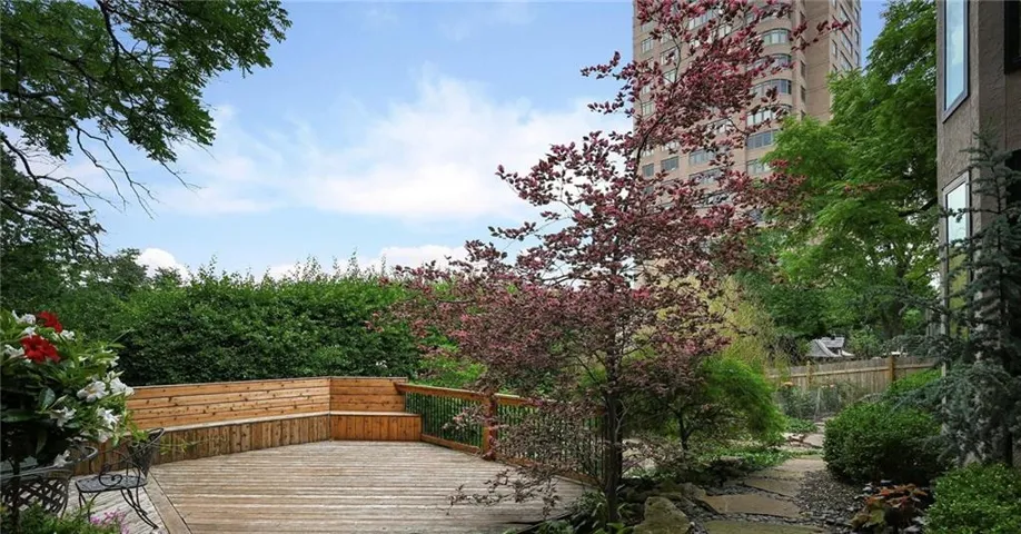 The back of the home features a 2nd large living area w/ tremendous space for entertaining. Featuring 18' ceilings, spiral staircase to rooftop decks, full bar, and floor to ceiling windows which overlook the backyard deck, patio and green space.\r\n