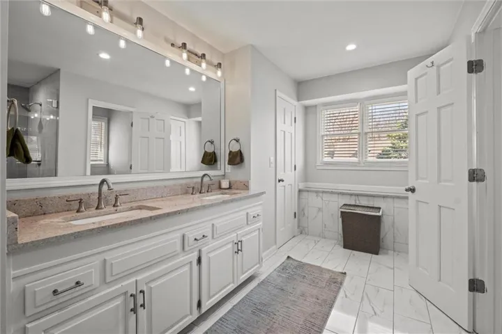 "LongDescription" => "Full bathroom with vanity, tile walls, plenty of natural light, and dark wood-type flooring"