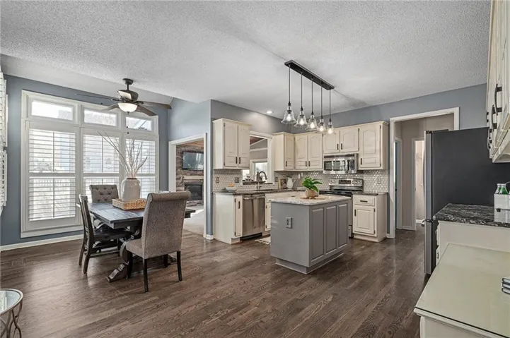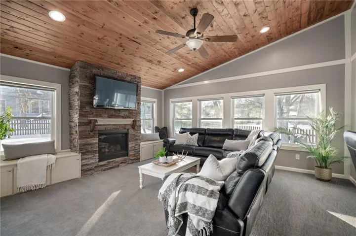Enjoy being greeted by stunning, newly refinished hardwood floors, leading to the comfortable living room and wrap-around fireplace. The cozy hearth room, spacious kitchen with stainless steel appliances and island, the breathtaking oversized all-season room with floor to ceiling stone fireplace— this layout is absolutely the perfect space for a fun family movie nights or entertaining friends and neighbors for a Chiefs watch party.\r\n