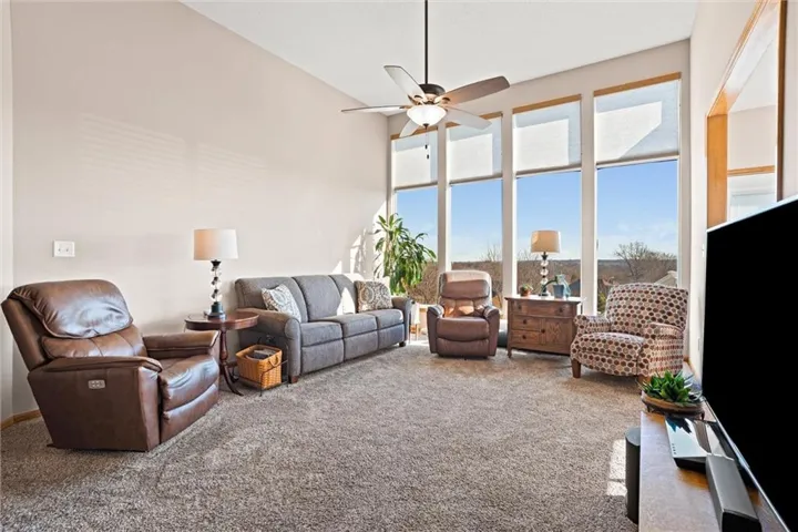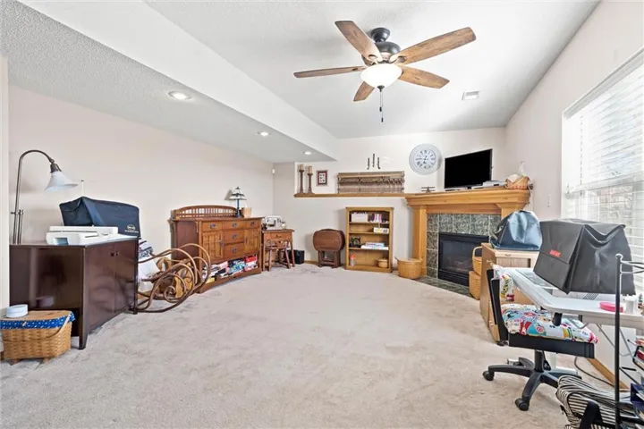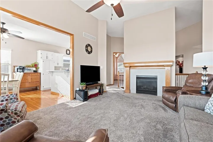 "LongDescription" => "Living area with a ceiling fan, light, wood-style floors, and crown molding, electric fireplace"