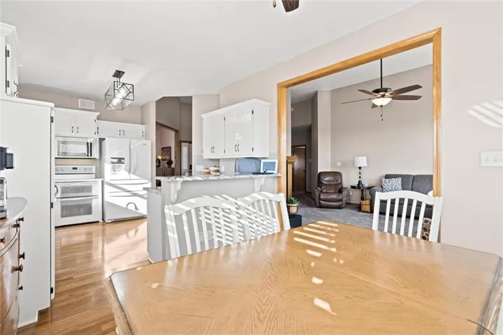 "LongDescription" => "Kitchen featuring appliances with stainless steel finishes, open floor plan, ceiling fan, light wood finished floors, and backsplash"