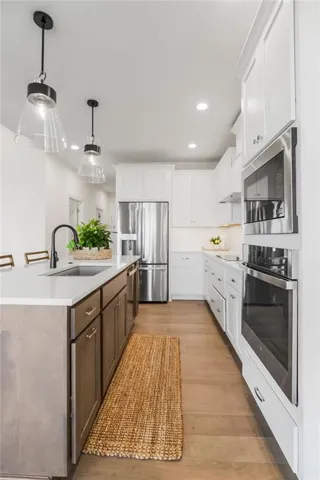 +"PublicRemarks": "HURRY TO MAKE THIS HOME YOURS! Only a few opportunities remain! Beautiful twin villa by French Homes with 2 Bedrooms on the main level! Hardwoods thru main living areas, tile bath & laundry floors, tile surrounds in all showers, granite or quartz vanity tops in all baths, island kitchen with granite/quartz counters & pantry, master bath has large walk-in shower & walk-in closet, iron spindles, and covered patio. Lower level has a rec room, bedroom and bath. Sqft, taxes, room sizes & lot size are estimated. This is a new community HOA and is subject to change as maintenance bids are received and work commences. Pool & Master HOA dues-$865/yr. PHOTOS ARE OF THE ACTUAL HOME."