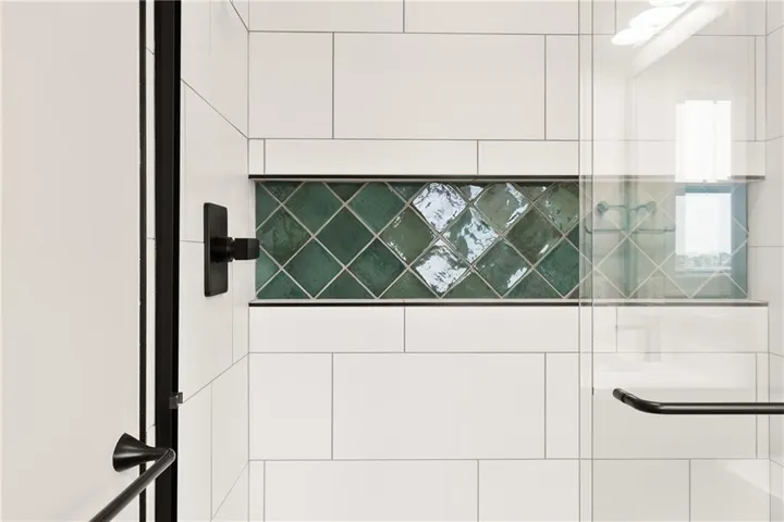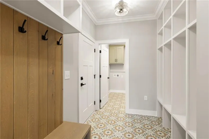 The mudroom and laundry room showcase designer tiles and feature custom built-in shelves, a boot bench, and additional cabinets for easy organization and folding.\r\n