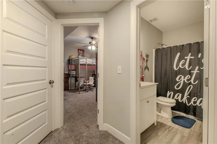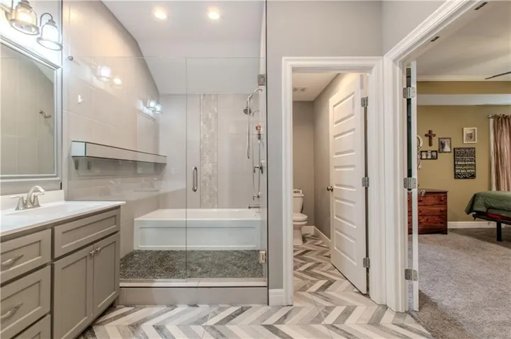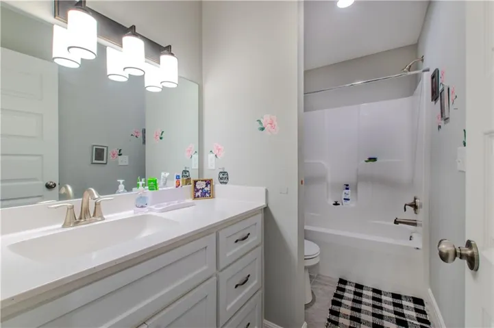 Step up into the beautifully designed kitchen/dining combo, complete with granite countertops, a walk-in pantry, a coffee bar, and a sliding glass door that opens to a covered deck overlooking the fenced backyard that has already been overseeded for spring. Adjacent to the kitchen is the luxurious master suite, featuring freshly painted walls, a tray ceiling, and a massive walk-in closet with brand-new carpet. The suite also boasts a double vanity and an incredible tub-shower combo that’s a true showstopper.\r\n