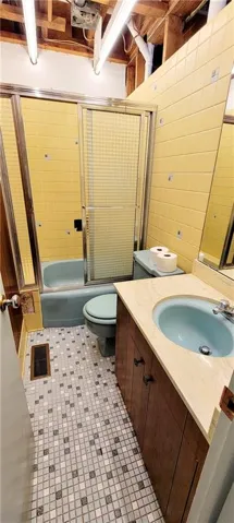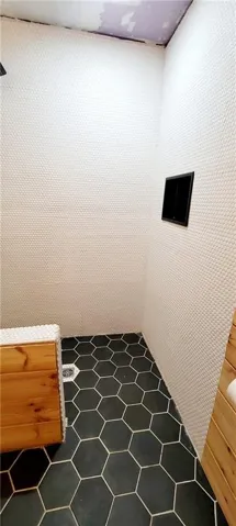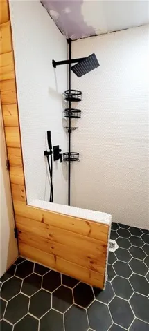 The hallway bathroom has undergone a Scandinavian modern renovation.\r\n