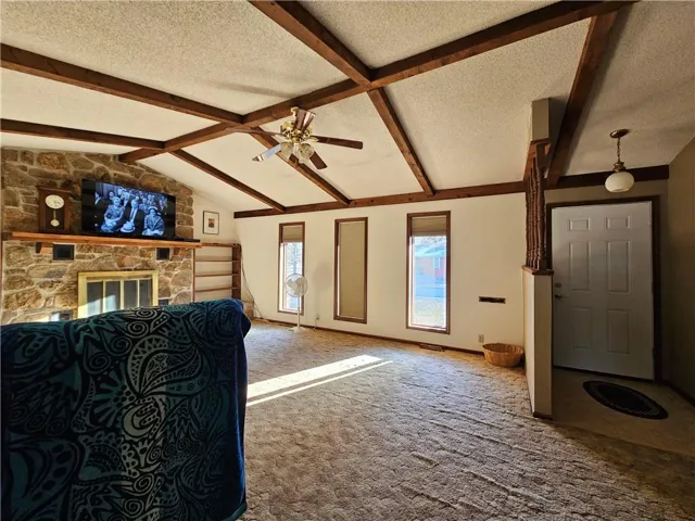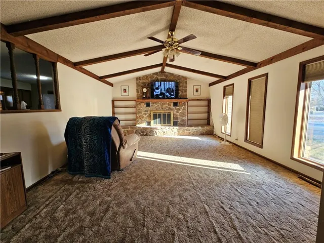 Step through the front door into the heart of the home: a grand living room that exudes warmth and character. A stunning stone, wood-burning fireplace takes center stage, flanked by built-in shelves perfect for displaying books or cherished decor. The cathedral ceiling, adorned with rustic rough-hewn beams, adds a sense of airy elegance to the space.\r\n