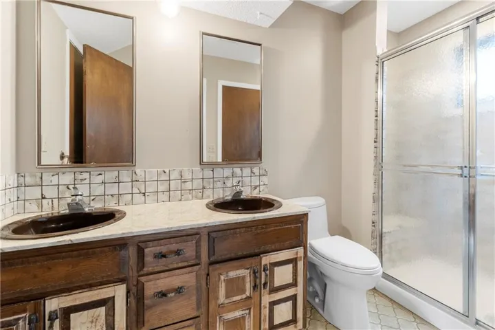 "LongDescription" => "Full bath featuring vanity, dark wood finished floors, wainscoting, tile walls, and a shower"