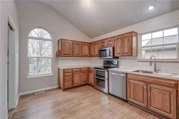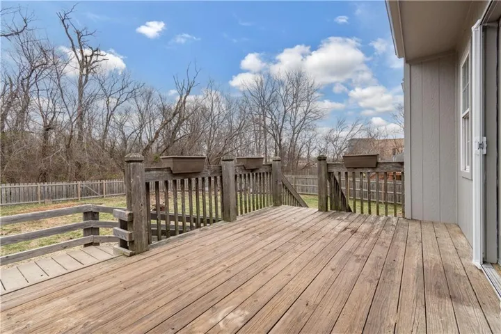 +"PublicRemarks": "Fantastic 3 bedroom, 3 bathroom split entry home in Blue Springs. Beautiful natural light in the large living room with vaulted ceilings, fireplace and LVP flooring throughout. Kitchen features tons of cabinets and all stainless steel appliances. main floor laundry room off the kitchen. Oversized dining room is ready for hosting! LARGE primary bedroom with walk-in closet. Primary bathroom with separate shower, tub, and vanity area. Two additional bedrooms are nicely sized along with additional full bath on main level. Basement includes family room with new tile flooring, third full bathroom along with huge storage room. Large backyard features deck and backs up to woods for extra privacy! Located close to restaurants & shops, and within the highly accredited Blue Springs school district. Recent updates include - all new exterior & interior paint, new tile flooring in laundry room, bathrooms and basement!"