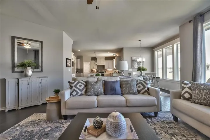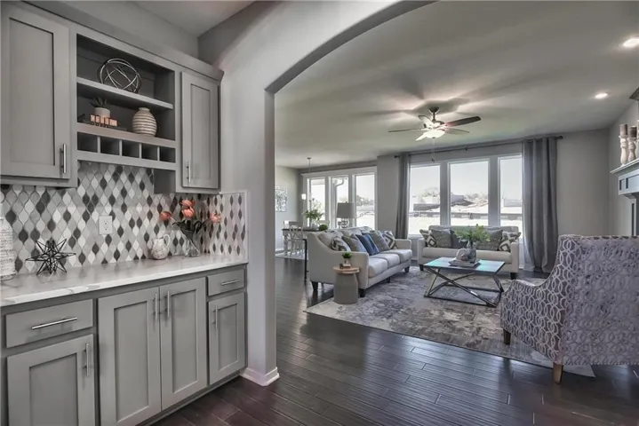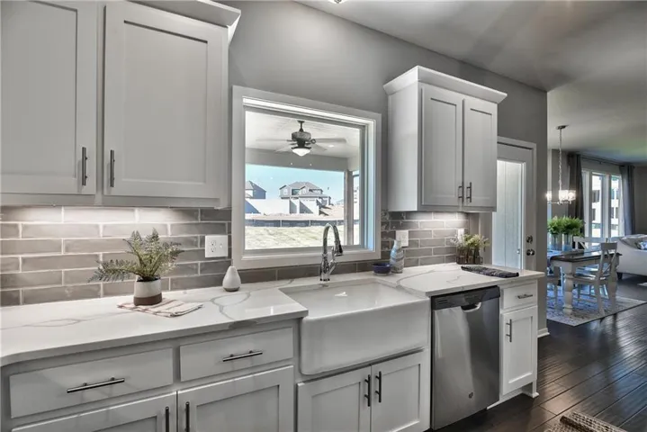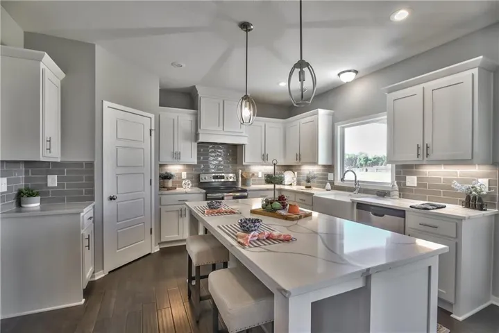 +"PublicRemarks": "Popular Harlow 5, 2 story with 5 bedrooms, 4 baths & 3 car garage has a lot to offer. Start at the entry with lovely turned staircase and hardwood floors. The formal dining room includes built in cabinets on both sides and leads into an open great room with fireplace and lots of natural light. The dining area and center island kitchen includes stunning hardwood floors, granite countertops, apron front sink, painted custom cabinets with upgraded hardware & soft close doors & drawers, stainless appliances, built in microwave and nice walk in pantry. First floor bedroom with closet is ideal for a guest room, office, sewing or craft room, playroom, etc. Upstairs you will find a large owner's suite that leads into a spa-like bath with double granite vanities, tiled floors, separate tub and walk-in tiled shower. Spacious walk in closet leads into the convenient laundry room. Two bedrooms with walk in closets share a Jack & Jill bath, each with their own vanity. The fourth bedroom has its own private bath and walk in closet. Huge unfinished basement with tons of storage, sprinkler system and more. Community includes a large pool, play area, cabana & walking trails. Prairie Farms is adjacent to the newly renovated Lake Olathe offering a number of outdoor activities. Check us out, it's a great place to call home!"
