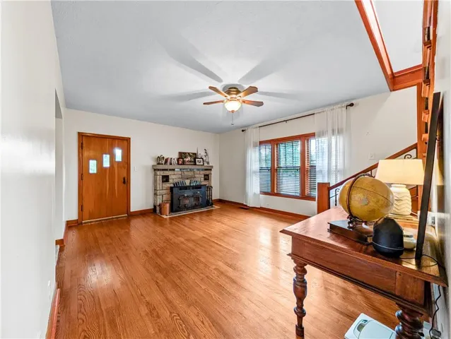The interior boasts 9-foot ceilings on the main level, enhancing the open and spacious layout. Hardwood floors flow through most of the home, while the living room and primary bedroom feature plush carpeting for added comfort. A cozy fireplace anchors the living room and serves as the heart of the home, creating a warm and inviting atmosphere. Architectural details, such as built-ins in the dining room, shiplap accents in the laundry room, and a distinctive staircase railing, lend character throughout. The kitchen is outfitted with a stainless steel appliance package, and faux wood blinds provide both style and privacy. The oversized bathroom offers a luxurious walk-in shower and a retreat-like feel, while the full unfinished basement provides ample storage and room for future customization.\r\n