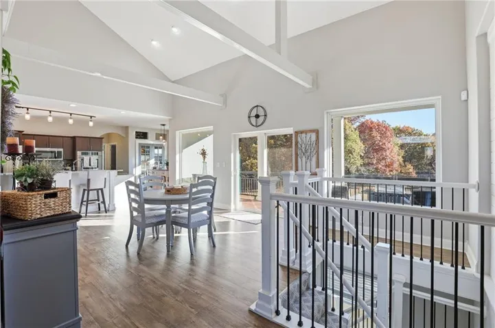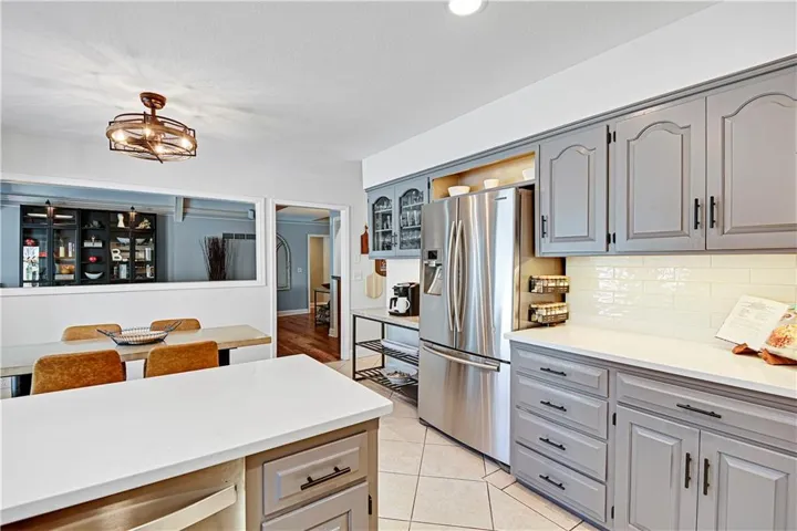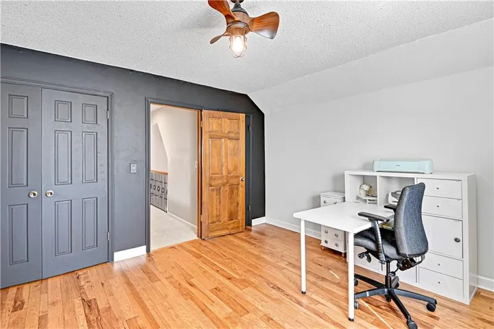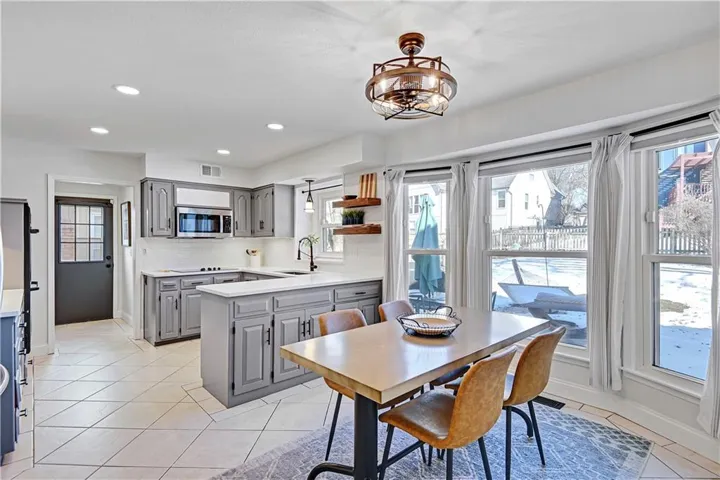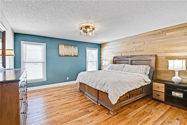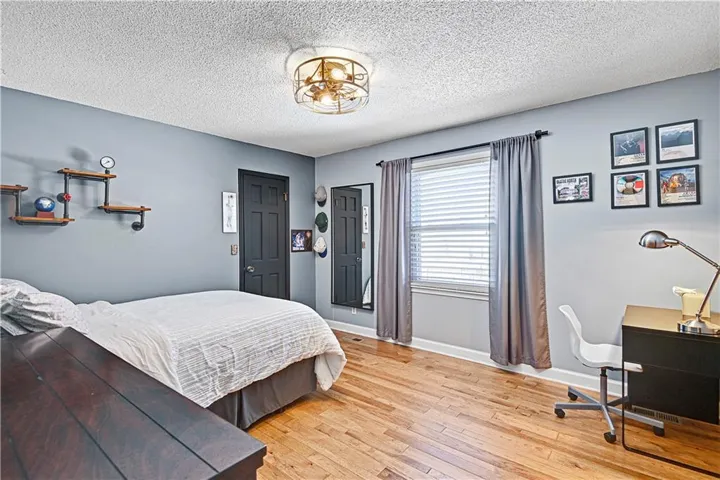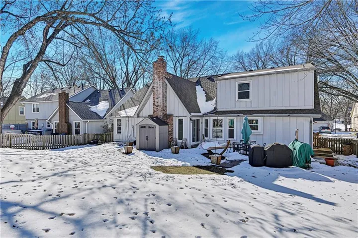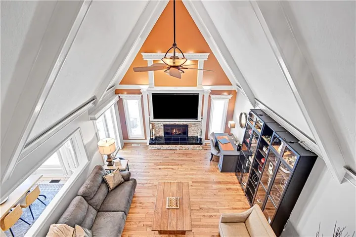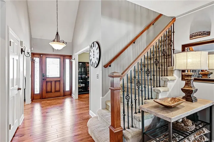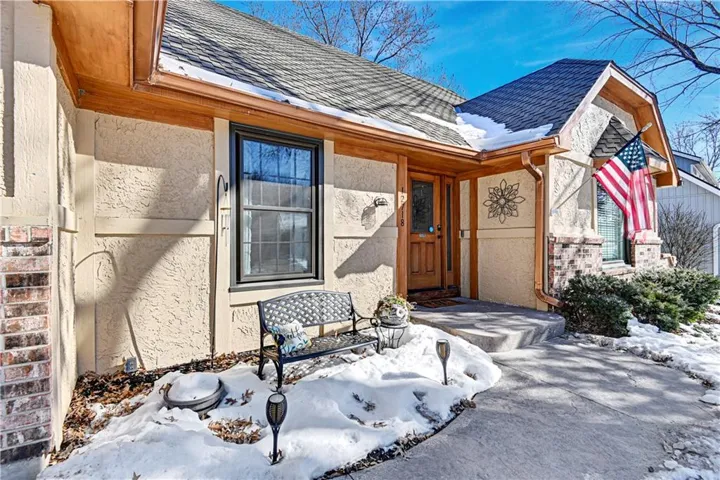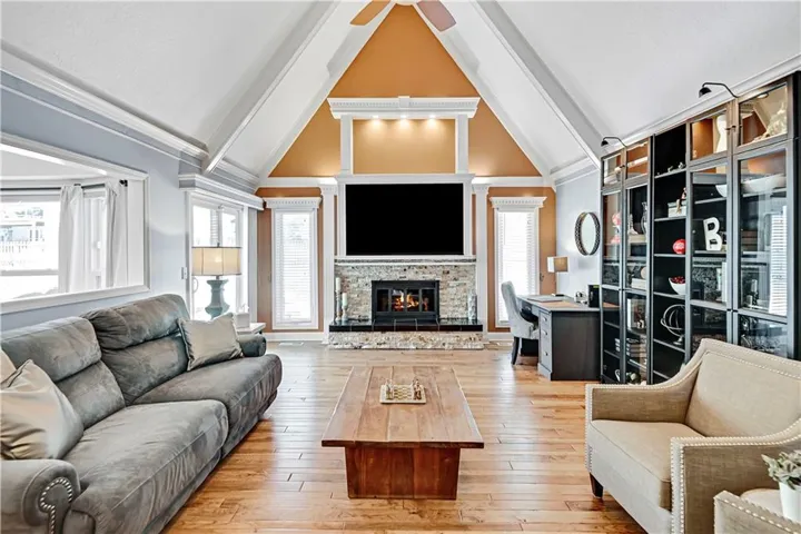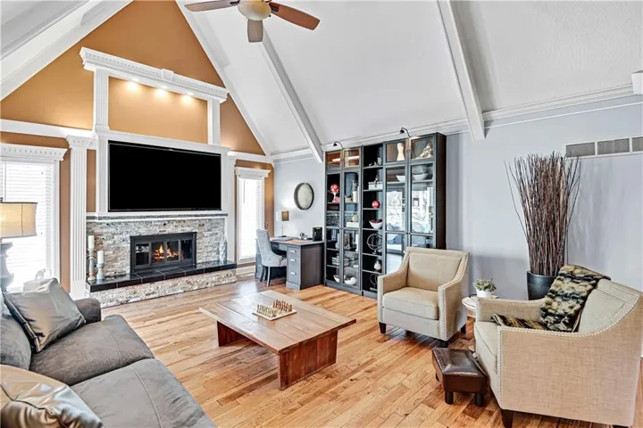 +"PublicRemarks": "Welcome to this stunning 1.5 Story with updates you will appreciate. Featuring both the primary suite and a versatile second bedroom on the main level, this additional space is perfect as a home office, flex room, or guest suite. Throughout this well-maintained home you will find real hardwood floors on main and bedroom levels. The great room is truly a showstopper, with vaulted ceilings, a cozy stone fireplace, and custom built-in space for a tv. The updated kitchen features quartz countertops, stylish backsplash, double ovens, new sink , breakfast bar and open to the great room. The spacious first floor primary bedroom features a charming accent wall and an updated bath with a newer shower, vanities and flooring. The dining room could serve as the second office. Notice the wrought iron railing and designer stair carpet as you head upstairs to the 3 large bedrooms and full bath. Check out the large, fenced yard with an easy to maintain patio, plus the extra storage building stays with the house. Plenty of space in the lower level for more storage or it would make a great exercise/recreation room. The HIGH END UPGRADES include a tankless water heater, 2020 HVAC system, 50-year roof replaced in 2019 and energy-efficient 5-panel tinted windows. Enjoy the perfect location with access to the neighborhood pond (across the street) and direct proximity to Stoll Park, where you can fish, take a stroll, or let your dog run free. In the heart of Johnson County with access to shopping, schools and hwys! Priced below recent appraisal!"