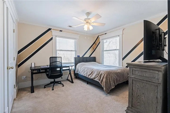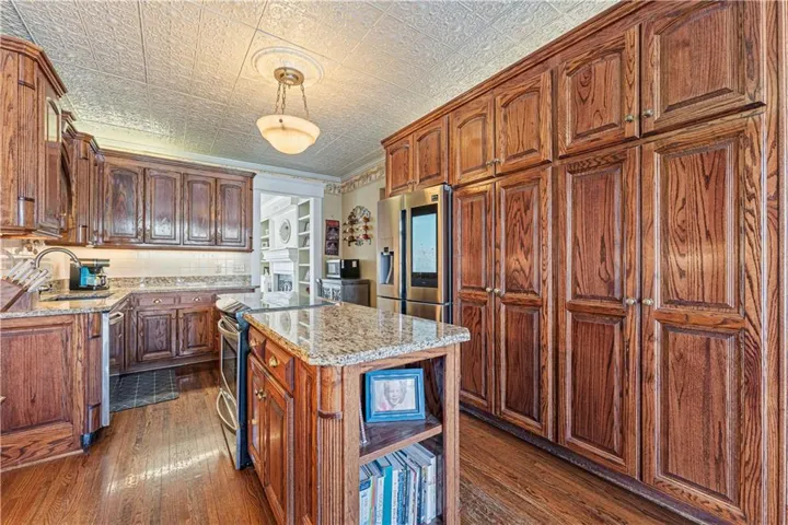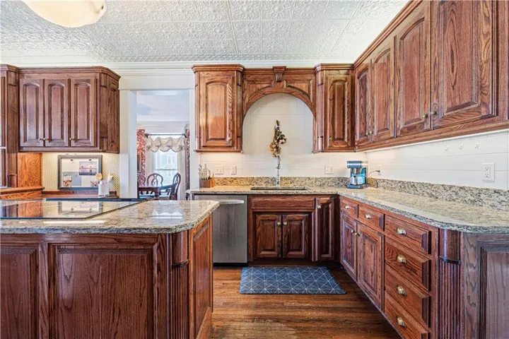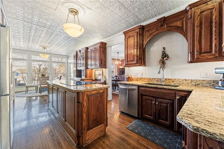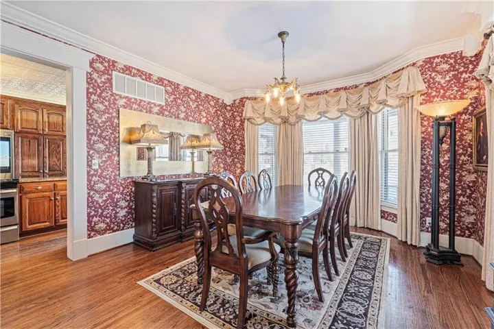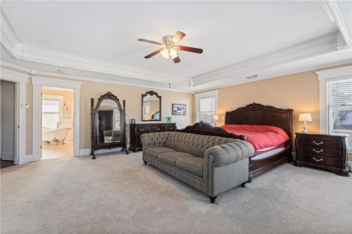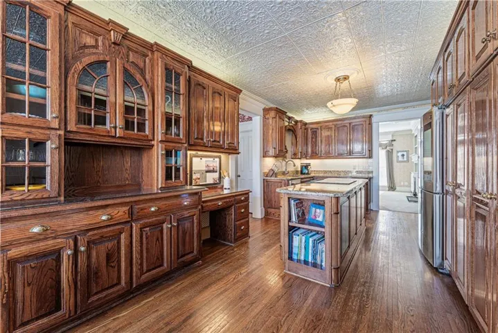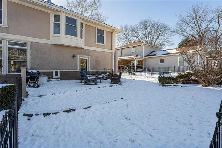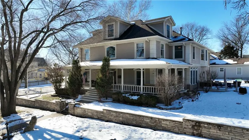 +"PublicRemarks": "So much space and charm in this majestic 3 story home near downtown Paola. You will absolutely love spending time on the wrap-around covered front porch. Inside you will find extensive crown molding & columns throughout. The owners have painstakingly removed most of the wallpaper throughout home. Huge kitchen has custom cabinets, granite counters, tin ceiling, hardwood floors, & pantry. Many of the light fixtures in the home are from the Jackson Hotel. The primary suite is ginormous with bay window, fireplace and original columns from 1903. The primary bath features a steam shower with custom mosaic tile, a claw foot tub, custom cabinetry with granite counters, and beautiful chandelier. Primary closet has built-ins and plenty of natural light! On the 3rd floor you will find a muli-purpose room and wet bar. This spectacular home sits on large double corner lot. The exterior is stucco with detailed crown molding. Nearly new furnace, AC and water heaters! Oversized 2 car garage provides plenty of space! New carpet has been ordered and will be installed prior to closing!"