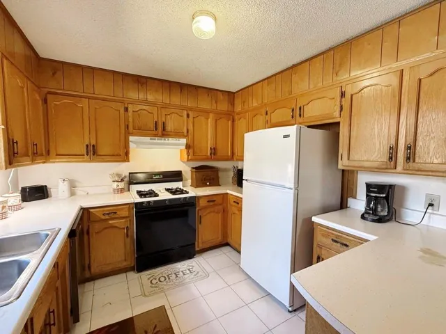 "LongDescription" => "Kitchen with a textured ceiling, dishwasher, brown cabinets, light countertops, and light flooring"