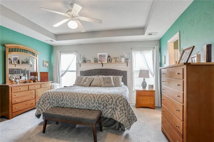 "LongDescription" => "Bedroom with multiple windows, light wood-style flooring, a textured ceiling, and ceiling fan"