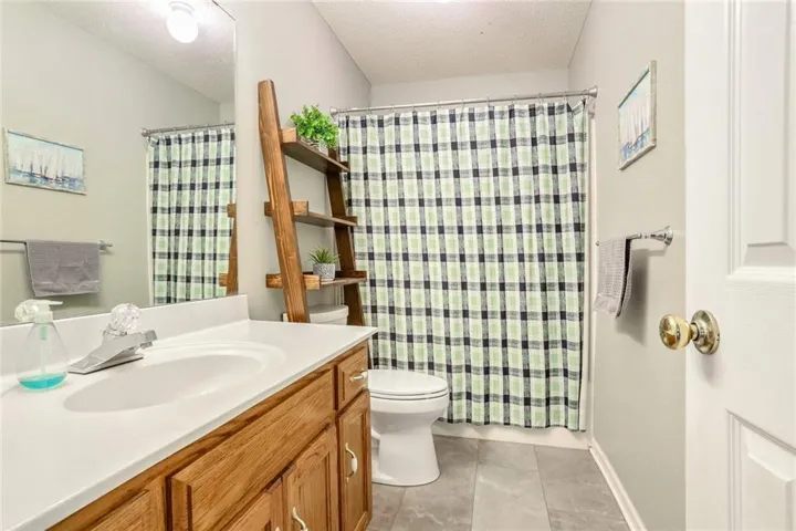 "LongDescription" => "Bathroom with vanity, a shower with curtain, tile walls, a textured ceiling, and a wainscoted wall"