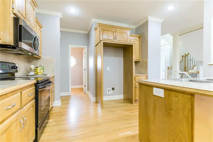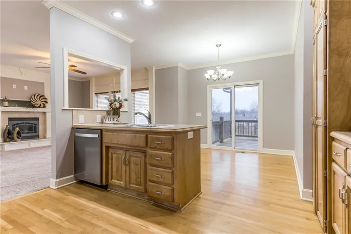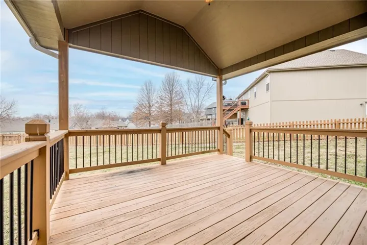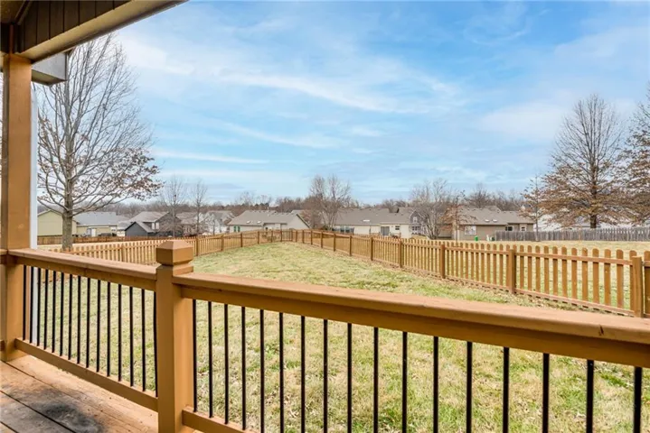The kitchen boasts wood floors, ample cabinetry, and an extra-large walk-in pantry, providing plenty of storage space. It opens to a covered deck with a ceiling fan, overlooking a large, fully fenced backyard—ideal for outdoor entertaining.\r\n