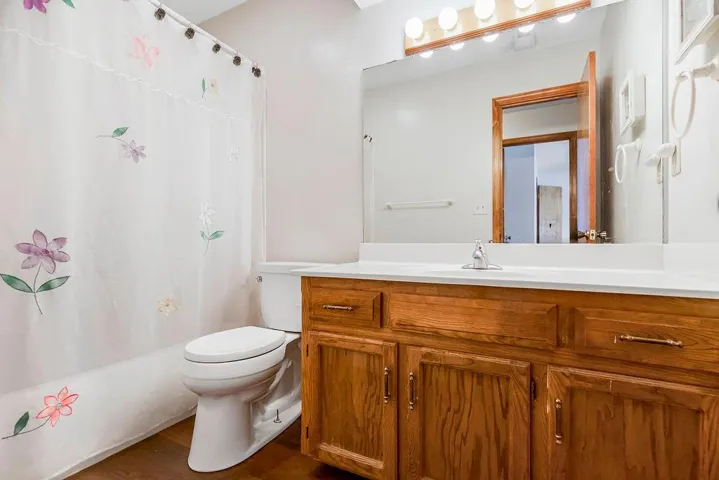 "LongDescription" => "Full bath featuring a shower with shower curtain, backsplash, vanity, and wood-style floors"