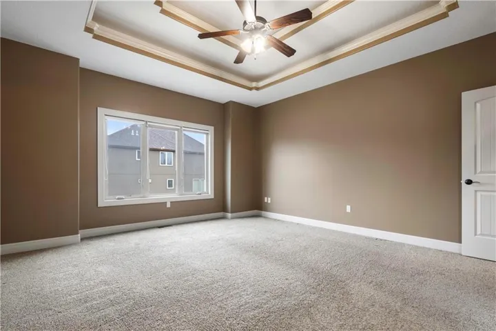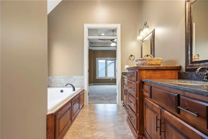 The main-level primary suite features a vaulted ceiling and a spa-like ensuite with dual sinks, a large whirlpool tub, a walk-in shower, and a spacious walk-in closet. A custom-built office with French glass doors provides the perfect workspace.\r\n