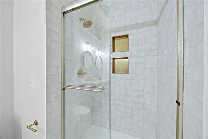 "LongDescription" => "Full bath featuring vanity, dark wood finished floors, wainscoting, tile walls, and a shower"