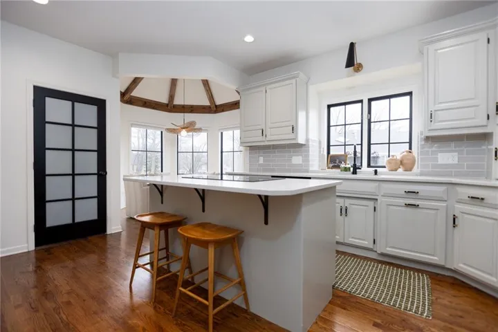 "LongDescription" => "Kitchen featuring decorative backsplash, light countertops, black dishwasher, and brown cabinets"