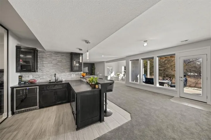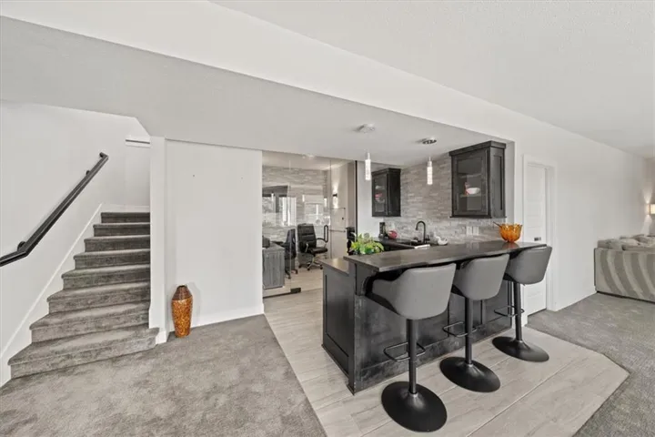 "LongDescription" => "Kitchen with appliances with stainless steel finishes, white cabinetry, tasteful backsplash, a breakfast bar area, and recessed lighting"
