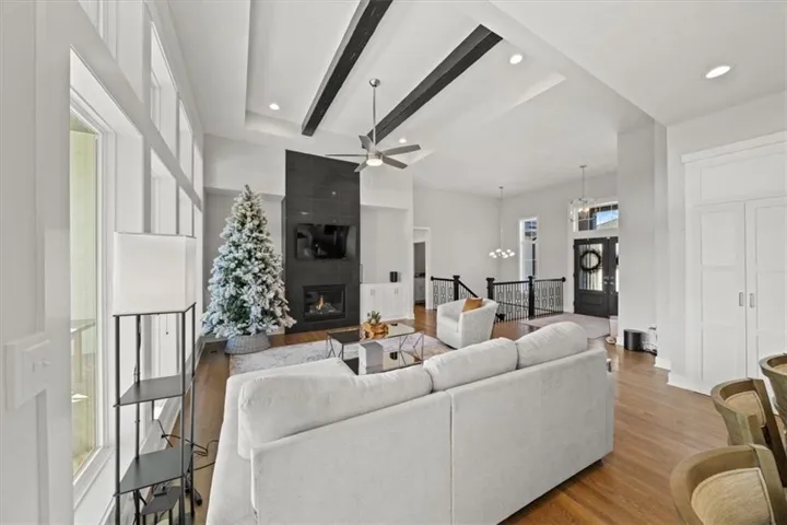 "LongDescription" => "Living area with beam ceiling, a tile fireplace, recessed lighting, and wood finished floors"