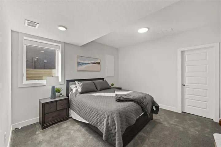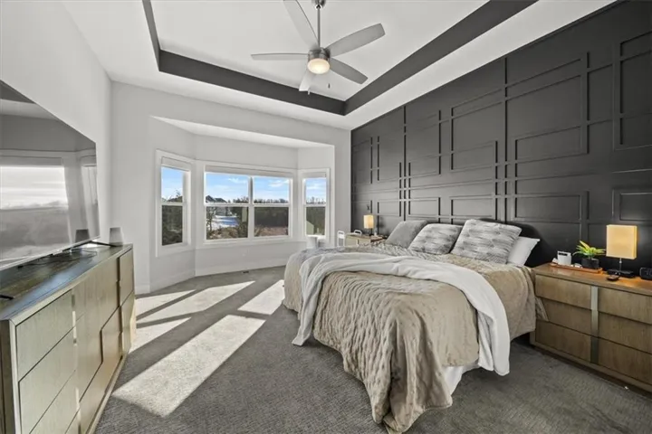 "LongDescription" => "Bedroom with light colored carpet, a ceiling fan, a raised ceiling, and recessed lighting"