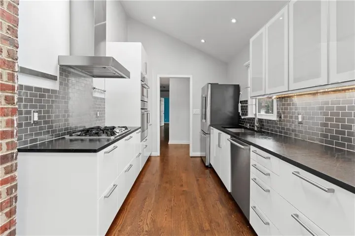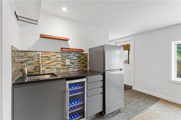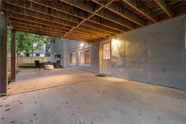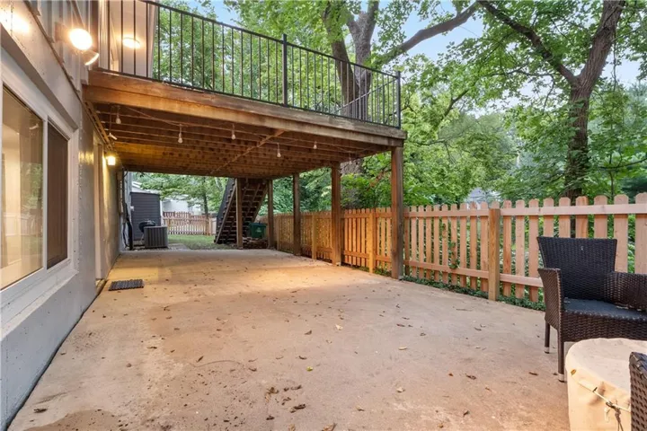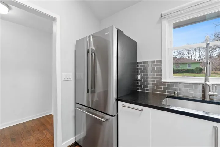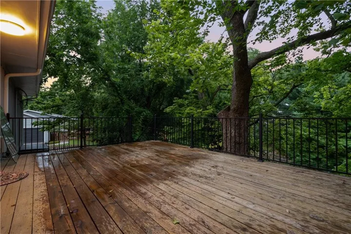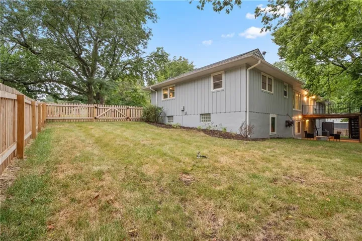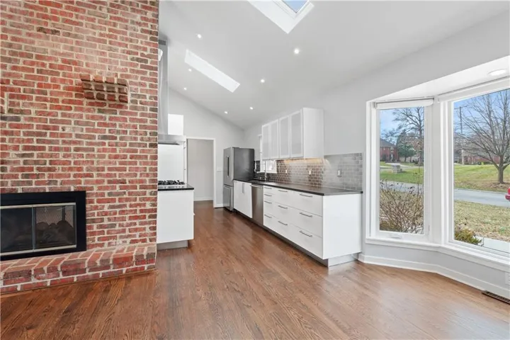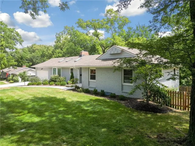 +"PublicRemarks": "BACK on the market AT NO FAULT TO SELLERS!! The seller has reconfigured the kitchen, cutting the countertop to accommodate a standard-size fridge, and added a wine fridge to the downstairs wet bar. Nestled on a serene half-acre wooded lot in the heart of Leawood, this updated ranch home blends timeless charm with modern convenience. Step inside to refinished original hardwood oak floors and an expansive living room centered around a stunning brick see-thru gas fireplace. Floor-to-ceiling windows in the dining room frame breathtaking views of a lush, wooded creek. The reconfigured modern European kitchen features striking black soapstone countertops, a gas range, double ovens, and ample storage. Vaulted ceilings with skylights flood the living and dining areas with natural light, while built-in Bose surround sound enhances the entertainment experience. The main level offers three spacious bedrooms, including a primary suite with an en suite bathroom, plus a vintage-inspired full hall bath. The remodeled walk-out lower level expands the living space with a versatile family room, wet bar with a new wine fridge, cozy TV den with built-in surround sound, a fourth conforming bedroom or office, and a third full bathroom. A separate laundry room and a man cave workshop with extensive storage complete the lower level. Step outside to a private backyard oasis, enclosed by a newer cedar fence, and enjoy scenic views of Dyke Branch from the newer deck. Additional updates include freshly painted interiors (2022), a newly pointed chimney, and a brand-new sewer line. Don't miss this rare opportunity—schedule your showing today!"