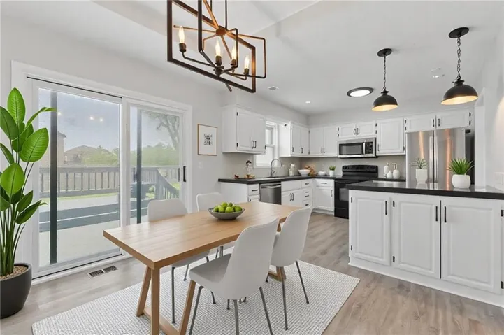 +"PublicRemarks": "Spacious 4-bedroom, 3 full bath home tucked into a quiet cul-de-sac! Enjoy fresh exterior and interior paint, newer hardwood floors throughout, vaulted ceilings, and a finished lower level perfect for entertaining—complete with a 4th bedroom. Step outside to a walkout backyard featuring an incredible outdoor living space. Situated on a generous corner lot with easy access to a nearby walking trail. Just minutes from Mahaffie Elementary and located near Olathe’s growing amenities. Come see it for yourself!"