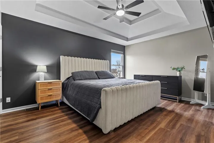 "LongDescription" => "Bedroom with dark wood-style floors, a textured ceiling, ceiling fan, and ensuite bath"
