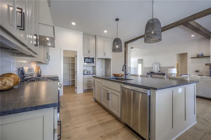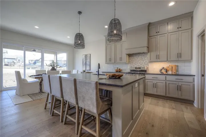 +"PublicRemarks": "STUNNING! This popular Reverse 1.5 story Chalet XP plan by KC Builders & Design will impress with over 3800 sq ft of finished living space! Enjoy loads of light from the wall of windows overlooking this open concept main great room that makes it easy to imagine comfortable evenings in front of the fireplace or gathering around the large granite kitchen island for morning coffee! The 10 -12 foot ceilings and beautiful wood beams offer a warmth throughout this gorgeous home! Wainscoting is featured throughout the main space, adding character and promotes a rich feel, at an incredible value! When you want to take the party outside, you will be spoiled by the 8x12 sliding door in the eat-in area, which leads to a covered patio, seamlessly blending indoor and outdoor living. Don’t miss the large walk in pantry with 2 access doors, one leading to the back entry off of the garage. The primary bedroom on the main level features vaulted ceilings and painted beams. The primary bathroom is truly spa-like, with a walk-in shower with 2 shower heads and a built-in bench, a free-standing tub, and cultured marble double vanities with ample storage. The bathroom connects the primary suite to the extra large walk-in closet with storage to the ceilings, and also attached to the laundry room for added convenience. The lower level of this home features a generous rec room with a gorgeous wet bar that features stained cabinets, granite tops and additional storage. The two lower level bedrooms are spacious and include walk in closets. With a full bath, this space offers versatility and space for various lifestyle needs. Around corner from Mill Creek Middle & Mize Elementary. Award winning DeSoto schools. New construction at this value is unheard of! Stop by and fall in love!"