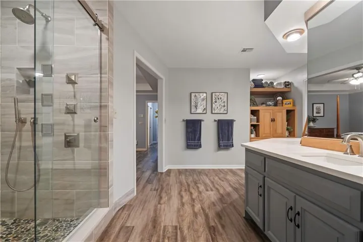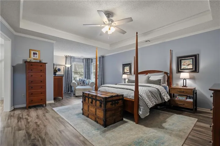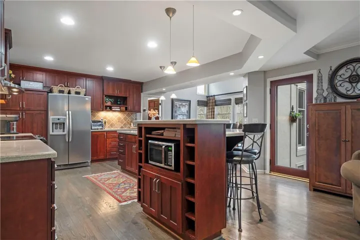 +"PublicRemarks": "Fantastic two story home with finished lower level in the Blue Valley School District. The home has been meticulously cared for including expanding/remodeling the kitchen, primary bath remodel (jetted shower and coffer bar) and adding finished lower level. The kitchen has custom cherry cabinets and lots of counter space. It is set up to entertain with a large island, casual dining space and opens to a large family room. Both rooms overlook a partially fenced backyard and a stamped concrete patio with gas fire-pit. The primary bedroom has a sitting room space and a great walk-in shower with jetted shower heads. Three additional bedrooms and hall bath all have walk-in closets. The finished lower level offers a workout space and currently recreation space big enough for a pool table and foosball table. There is a half bath and wet bar that make the finished basement great for everyday living and larger gatherings. Nottingham Forest South has a great amenity package with a lifeguarded pool, tennis and pickleball courts. Harmony Elementary and Middle Schools are on the west side of the neighborhood. Johnson County Parks and Rec sports fields, walking trails and soccer fields are literally right next door. Shopping and highway access make Nottingham Forest South a very desirable place to live."