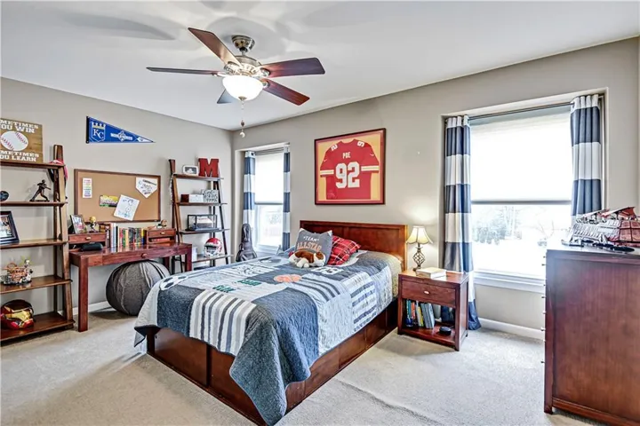 "LongDescription" => "Bedroom with a tray ceiling, a ceiling fan, and dark wood finished floors"