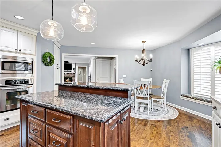 "LongDescription" => "Kitchen with ornamental molding, white cabinetry, stainless steel appliances, hanging light fixtures, and dark wood-style flooring"