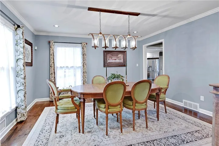 "LongDescription" => "Dining area with dark wood-style floors and ornamental molding"