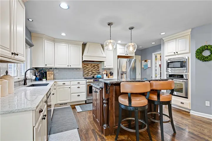 "LongDescription" => "Kitchen with stainless steel appliances, a kitchen breakfast bar, dark wood-type flooring, a center island, and decorative light fixtures"