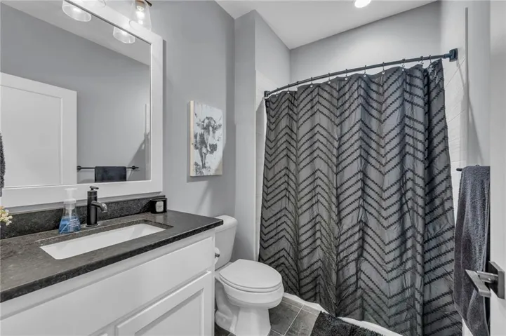 "LongDescription" => "Bathroom with a textured wall, vanity, a textured ceiling, shower / tub combo, and light floors"