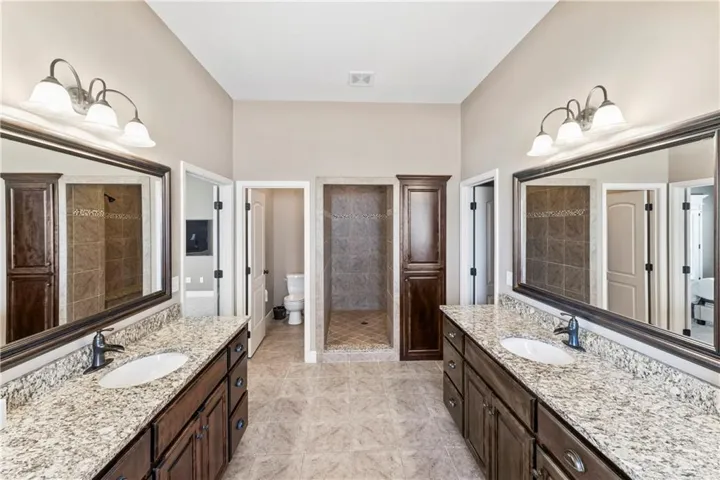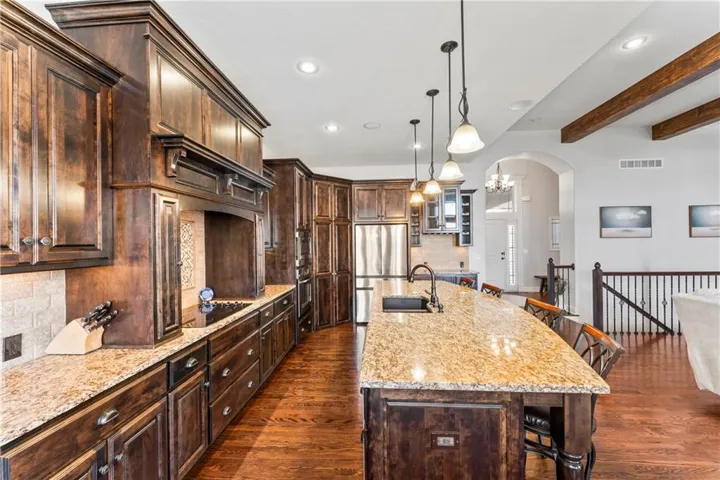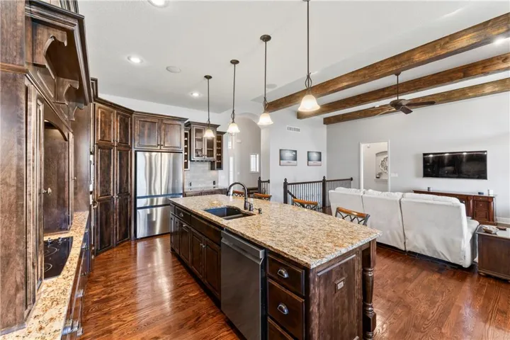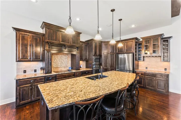 +"PublicRemarks": "AMAZING Reverse 1-1/2 Story "Emery" plan by James Engle Custom Homes. New Roof! Enjoy true 1 floor living with a Primary Suite and second bedroom Main level. Open floor plan featuring a large updated Kitchen w HUGE island, Granite counters, Stained cabinets, Walk in Pantry and Dry Bar. Great room was Award winner when built and has a beautiful Fireplace double sided to Covered deck. Spacious Primary suite offers European walk-in shower, dual shower heads, granite vanities, & jetted tub. Finished Walk out Basement is perfect for entertaining with a Full bar and Large family room to watch all the games! Basement also features 2 bedrooms and a full bath. Lots of storage space also That is hidden by a beautiful Large barn door! Walk out basement has a relaxing covered patio of Bar, Enjoy a cocktail or coffee while relaxing. Homes do not come to market often in this area. Elementary, Middle and High School are all within .5 miles for the perfect location."