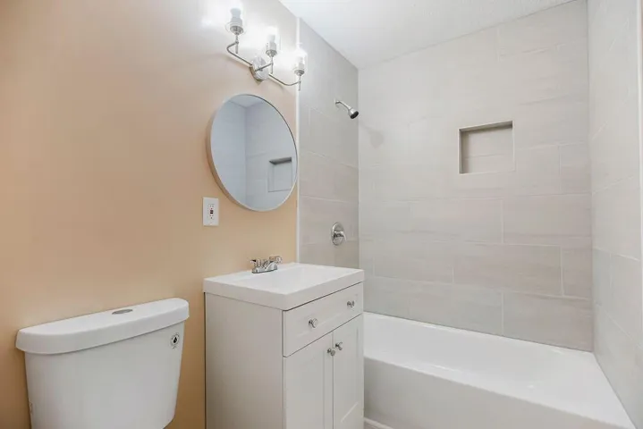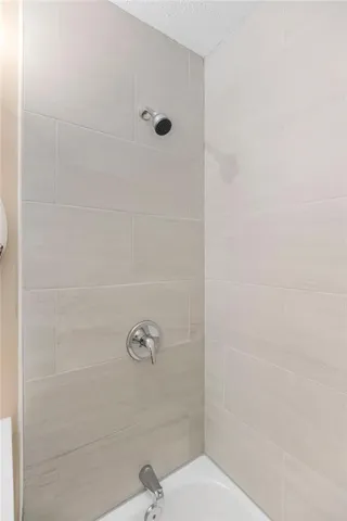 "LongDescription" => "Bathroom with a textured wall, vanity, a textured ceiling, shower / tub combo, and light floors"
