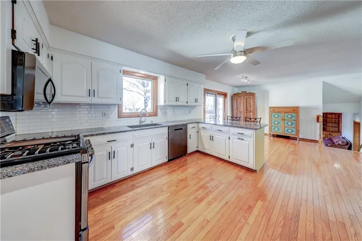 +"PublicRemarks": "Winner in curb appeal! Attractive Side Entry Garage. Fenced yard and new deck. Large yard has sprinkler system . 5 yr old roof, Impeccably maintained with gobs of square footage. New granite counters and hardwood floors in the oversized kitchen that has been remodeled! Large formal living room and dining room off kitchen. The primary bedroom is spacious with 2 closets. 2 bedrooms on 2nd level. The charming loft leads to a huge bedroom on 3rd level. The Family room has fireplace and non-conforming 5th bedroom with bath in lower level."