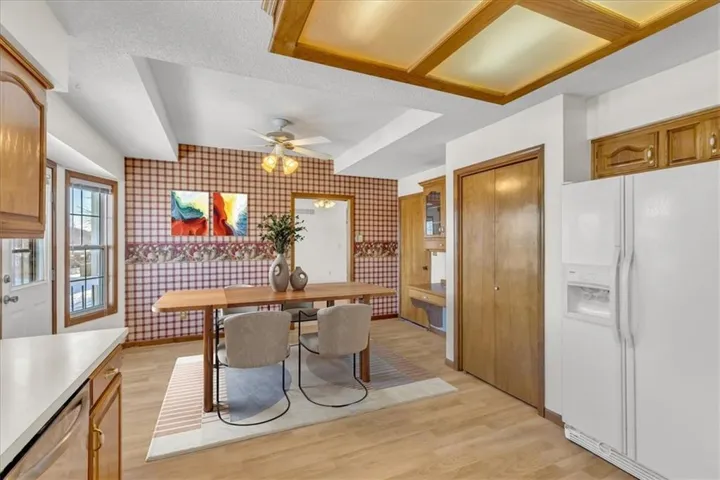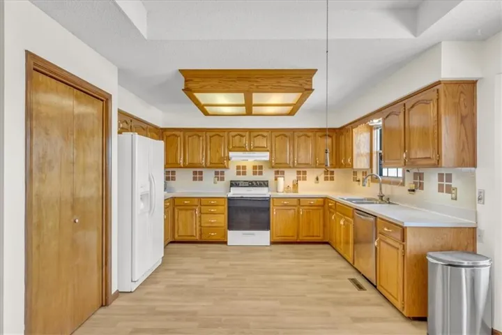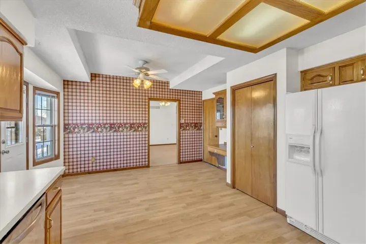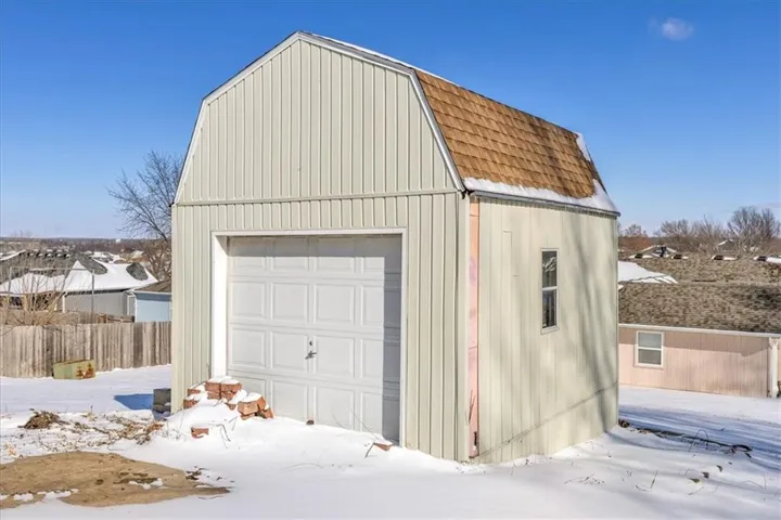 +"PublicRemarks": "There is something good in this neighborhood! This main level living ranch is a must see! All bedrooms, bathrooms, and laundry room are on the same level for convenient living. Walk in the front door and enjoy the high ceiling and brand new interior paint throughout. The main bathroom has a vaulted ceiling and skylight and is connected to the main level laundry. Each bedroom has nice big windows. This house sits up on a hill with fantastic views looking east from the nice composite deck. The floor plan flows easily as you head downstairs to enjoy a walk out style set up with brand new concrete epoxy flooring. The basement has versatility for storage or one could create another living space. The basement also houses a large workshop/craft area and third garage. Beyond the house there is an outdoor shed for more storage and right across the street from this corner lot home there is a small neighborhood park and trail ready for exploring! So much space to grow and make your home!"