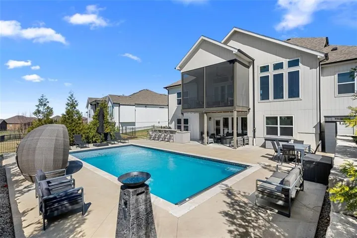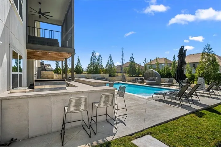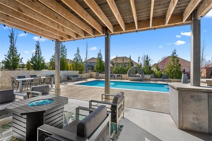 • OUTDOOR LIVING: A peaceful retreat featuring a heated saltwater pool w/ seats & electric retractable cover. The outdoor kitchen, complete w/ bev fridge & high-end built-in gas grill, makes this space the Star of the Show! Beautiful landscaping & color-changing pool lights create a true paradise.\r\n