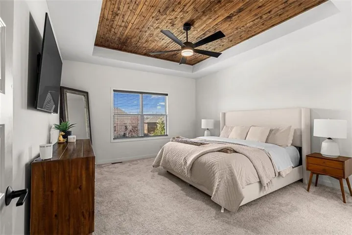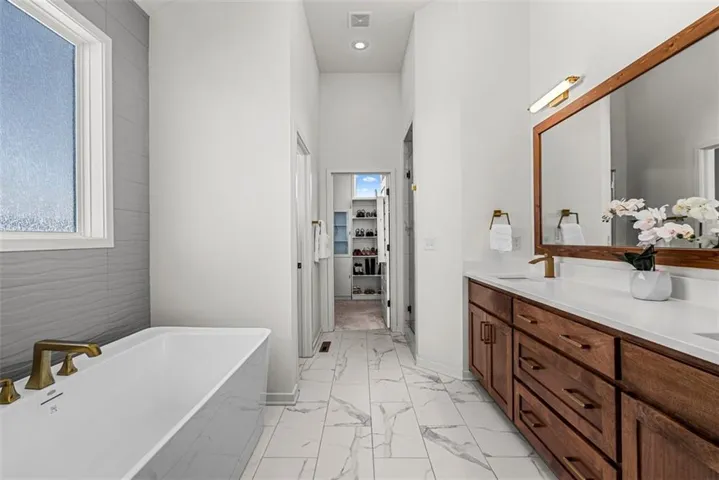 • ENSUITE: A serene main-level retreat w/ vaulted ceiling, contrasting boxed wood beams & a large walk-in closet connected to the laundry room. The spa-like bath includes double vanities, a walk-in shower & a freestanding soaker tub for ultimate relaxation.\r\n