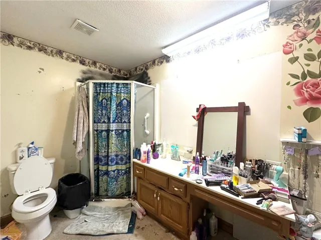 "LongDescription" => "Bathroom with a textured wall, vanity, a textured ceiling, shower / tub combo, and light floors"