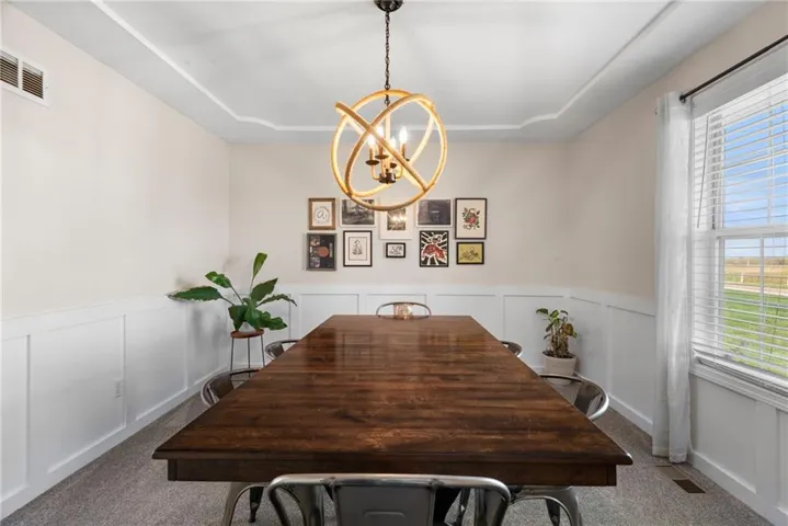 "LongDescription" => "Dining space with dark wood-type flooring, crown molding, and suspended lighting"