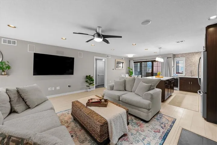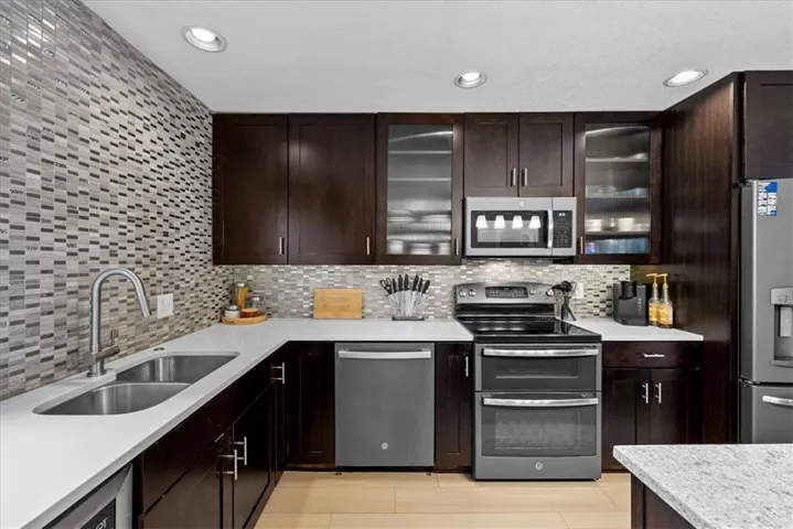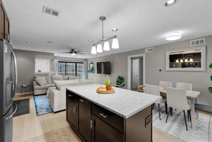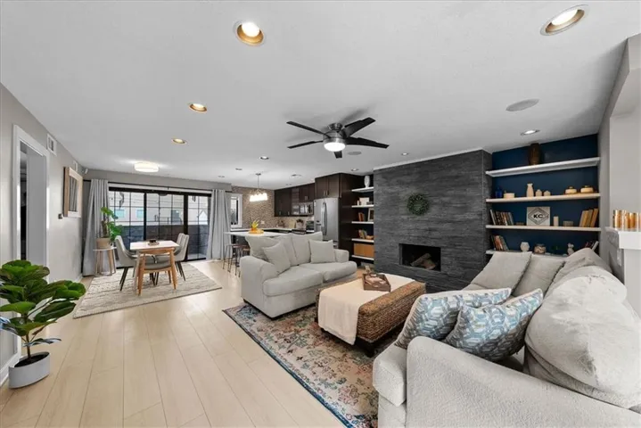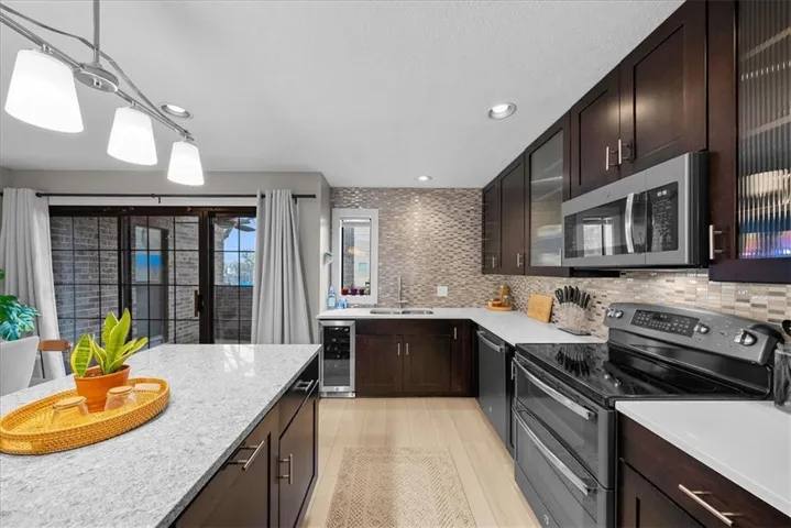 +"PublicRemarks": "Welcome to Inglenook Plaza – a true showstopper! This updated, meticulously designed condo is a rare gem you won’t want to miss. As you step inside, you’ll be wowed by the stunning luxury vinyl plank flooring, setting the stage for high-end finishes throughout. The grand fireplace, complete with custom built-ins, serves as the perfect focal point & overlooks a fully custom KraftMaid kitchen. This unit offers two spacious bedrooms, two beautifully appointed bathrooms & a private, secured parking space for convenience. Enjoy sipping your morning coffee on the porch or unwinding on the patio—there’s no shortage of outdoor space. Key features include recessed lighting throughout, built-in speakers in the family room for an immersive TV experience & a chef’s dream kitchen with custom KraftMaid cabinetry, quartz countertops, soft-close drawers/cabinets, thoughtful built-in storage, including dedicated spaces for sheet pans, trash bins & a wine fridge. The kitchen also features under-cabinet lighting & all stainless steel appliances. The primary en-suite offers convenient laundry & two closets for maximum storage. The updated hall bathroom boasts gorgeous custom tile work & quartz countertops, while the second bedroom offers plush carpeting. Ceiling fans ensure comfort & the kitchen lighting adds elegance. During the summer, you’ll love the private pool oasis, plus access to an exercise room, clubhouse/theater, communal laundry, a grill area & two dog stations for your furry friends. Other amenities include off-street gated parking, CCTV with five cameras, a secure entry, Google Fiber readiness, a Nest smart home thermostat & additional hallway storage. Located just one block from the Kansas City Streetcar, this condo offers unparalleled convenience, placing you minutes from the Country Club Plaza, Vibrant Westport, Crossroads & the River Market. Don’t miss the chance to own in the heart of Midtown—this gem won’t last long!"