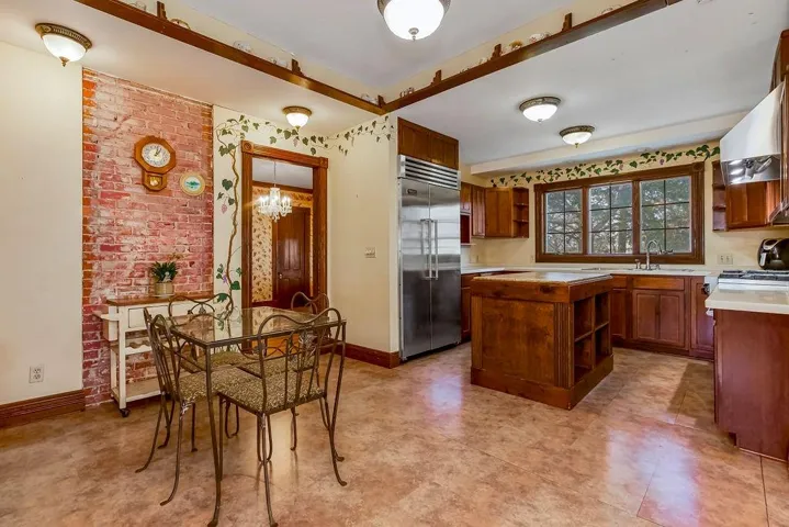 +"PublicRemarks": "Priced for a quick "as is" sale! Amazing home, built by lumberman M.A Schroeder in 1893, is full of character and charm. Original stained-glass windows, frame pattern oak hardwood floors, intricate doors with transom windows, crown molding, & built in cabinetry. This home has seven bedrooms and six full baths plus a powder room. Enter into the grand living room, formal dining, billiard/library, powder room & office. Main level master suite includes a living room and full bath/walk-in closet. Large kitchen has tons of cabinet space, pantry, Viking gas stove and stainless-steel fridge. Custom granite island was once part of the Western Spirit Newspaper office. Spacious laundry/mud room with lots of counter tops and storage. Take either the decorative front staircase or back stairs to the second level where there are five bedrooms, four full baths, and laundry closet. The second floor master suite has a sunroom attached with access to the balcony. The third floor was converted to the main master suite with full bath, dressing area, and walk-in cedar closet, for the last of only five homeowners of this 135 year old home. Occupying an almost ½ acre corner lot with a beautiful gazebo and garden area. Original carriage house has the old feed bins, dutch door, and loft area. A garage door opener has been added for a covered parking space. This is a chance to own a part of Paola’s history!"