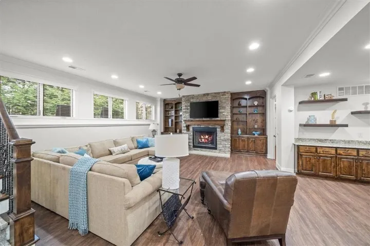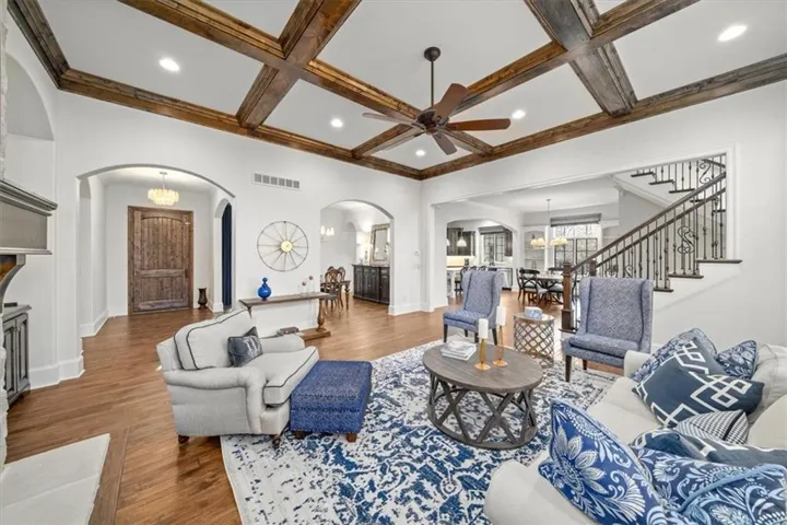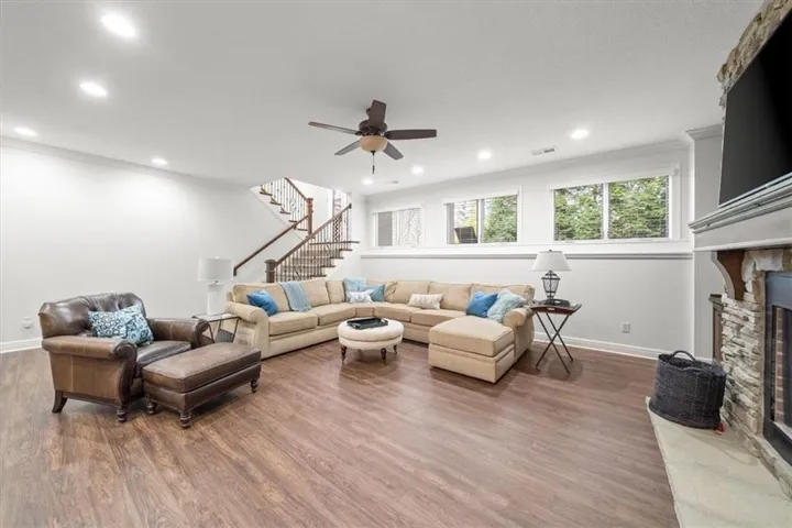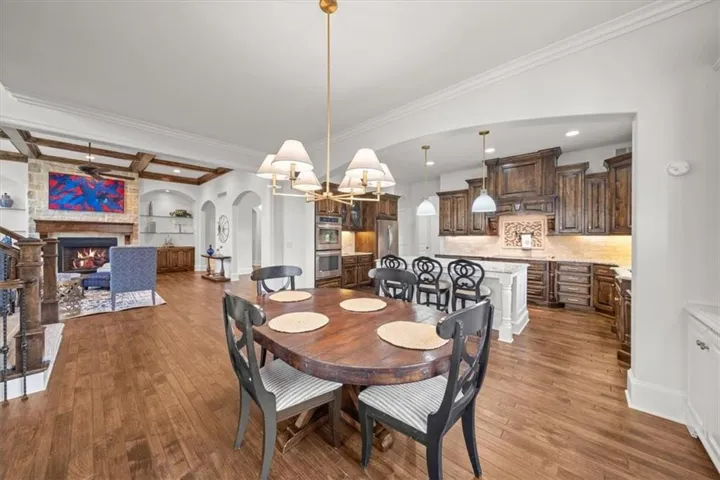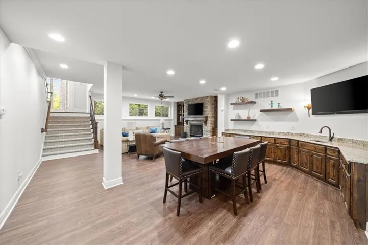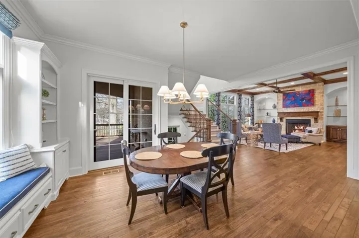+"PublicRemarks": "Beautiful newer home in coveted Historic Leawood. As soon as you drive up to this gorgeous, tree-lined lot w/ a circle driveway, you will know you are entering one of the finest homes available in Johnson County. From the rich walkway to the stone, brick & stucco exterior, every detail exudes timeless craftsmanship. The main level features 12’ ceilings, hardwood flooring, & a breathtaking flow of living space. A stone fireplace is featured in the large great room which opens to the formal dining and breakfast areas. The kitchen is a chef’s dream come true with spectacular custom cabinetry, granite countertops, walk-in pantry, double oven, and impressive island. All of this is surrounded by floor to ceiling windows providing a view second to none. The expansive main level owner’s suite features, hardwood floors, an en-suite bath with large shower & separate tub, huge closet & main level laundry room. A second kitchen area, half bath, mud room & separate large media room/office/playroom are off the kitchen providing more versatility & functionality with very easy accessibility. Adding to the livability of the main level is a beautiful covered porch with a fireplace providing the perfect setting for 4 season enjoyment. The upper-level features 3 large bedrooms & 3 full bathrooms, built in bookshelves & its own laundry room. The magnificent lower level has true 10-foot-high ceilings & flows openly from the main level w/ a wide-open staircase. It features 2 large bedrooms, a family room w/ a fireplace & wet bar. There is also a new workout room w/ cushioned flooring & climbing wall. With all of that, there is still a safe room & loads of storage. This once in a lifetime home features zoned heating & cooling for all three levels. It also includes a Generac generator in case of an electrical outage. The .45 acre lot has mature landscaping, an outdoor gas firepit & iron fenced backyard."