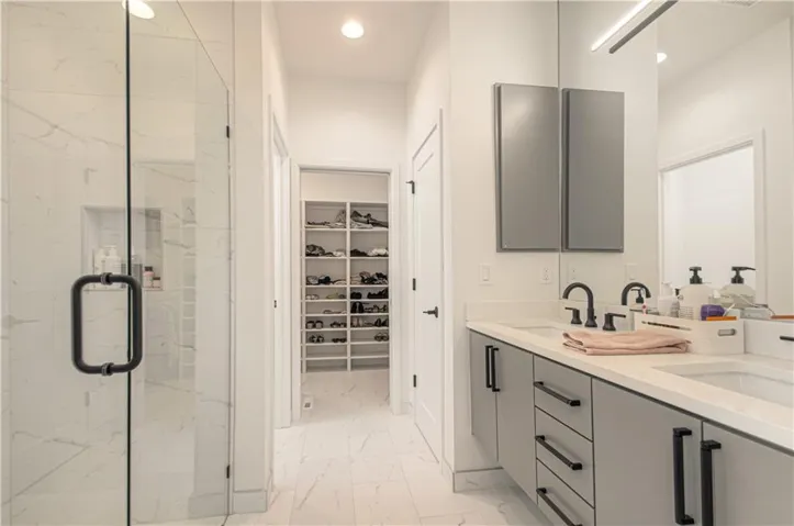 "LongDescription" => "Full bathroom featuring two vanities, suspended lighting, a walk in closet, a shower with shower door, and light tile patterned floors"