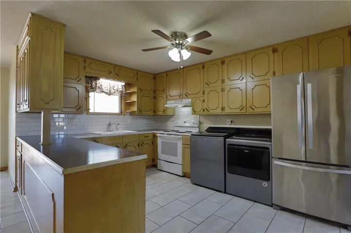 +"PublicRemarks": "ALL brick and stone exterior on this expansive 5 bedroom, 3 bath home with a beautiful backyard! This home boasts an open main floor plan plus a main floor primary suite with an en suite bathroom. You'll find 2 additional main floor bedrooms and a full hallway bathroom which includes a $13K walk-in Jacuzzi tub with shower attachment. There are 2 more bedrooms along with a third bathroom on the second floor. All the bedrooms are very spacious with carpet over hardwood flooring. The kitchen has an abundance of cabinets and counter space. Don’t forget the finished family room in the basement with the second fireplace, carpet and a storage room or small home office area! The roof, furnace, air conditioning unit and hot water heater are nearly new! The dishwasher was replaced in 2024. The washer and dryer are negotiable. The shed is also negotiable. This home features an extra wide and deep 3rd garage in the rear, perfect for storage or a workshop! The main level garage is 20x23 and even has a fireplace, making it an ideal entertainment space for parties and gatherings or man cave! Or consider your man cave or additional living space by finishing the third garage in the basement, which is 22x26 feet of unfinished space! Enjoy the outdoors with two sliding doors leading to the large deck and backyard. The owner is leaving the small fenced area off the garage sliding door for your pets, and the lot is surrounded by neighboring fences, just needing the front tied in to be a completely fenced yard. This is the perfect home for a growing family! With hardwood under all the carpet per the owner, this home is ready for you to make it your own. Don't miss out on this incredible opportunity!"